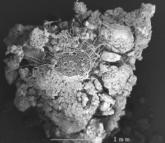 This electron micrograph shows a cross section of a wheat root and its rhizosphere, in which soil particles are held together by exudates from the root and root hairs. Photo: Michelle Watt et al. Functional Plant Biology (2005)